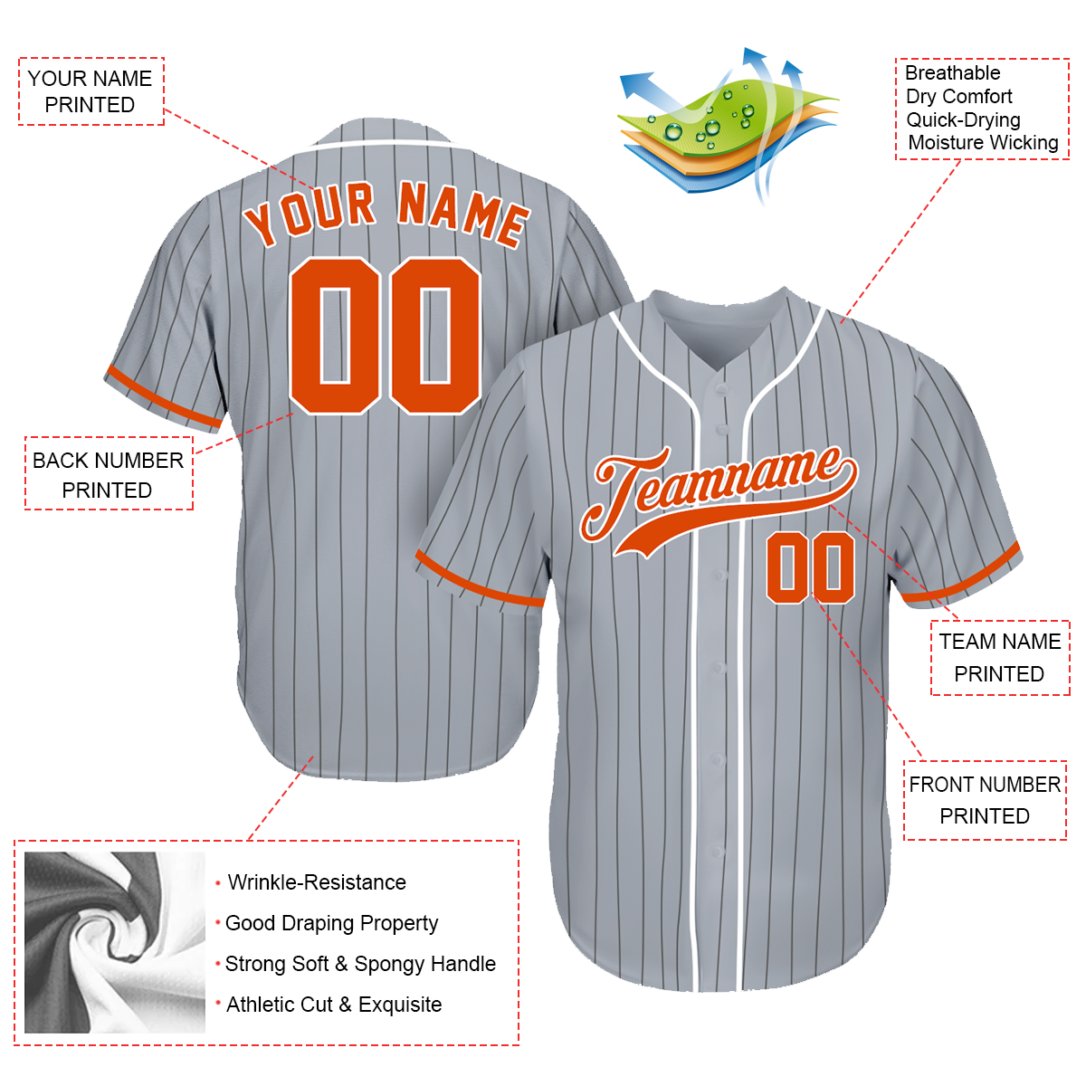 Custom Jerseys Baseball - Best Baseball Fan Gifts - Pinstripe Gray White Orange - Fathers Day Baseball Gift